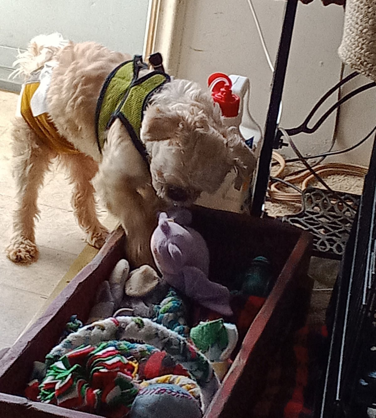 Jeb loves to be outside, but most of all, he loves toys! He will empty the toy box and have his toys everywhere around him playing with them.