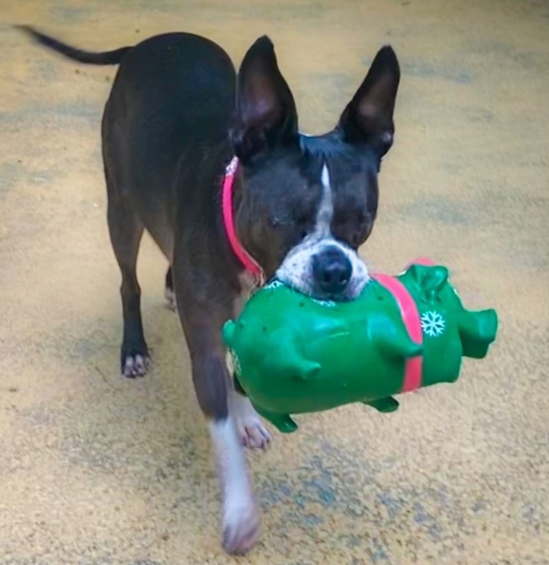 Summary: Peanut Piper is a Boston Terrier mix. She is completely blind having had her eyes removed April 2024 due to untreated glaucoma. They were causing her a great deal of pain and discomfort. Since then, she has recovered fully and with enthusiasm! Peanut loves life and does not let her disability slow her down! She quickly learns to navigate surroundings. For instance, within 2 to 3 weeks, she remembered where to sit for her food, where the water dishes are located, where both back doors are located, and the obstacles of the backyard. Most importantly she knows where the couch and the bed are! She jumps up onto the couch herself and navigates pet steps up to our bed and jumps off! Not that we encourage that!!